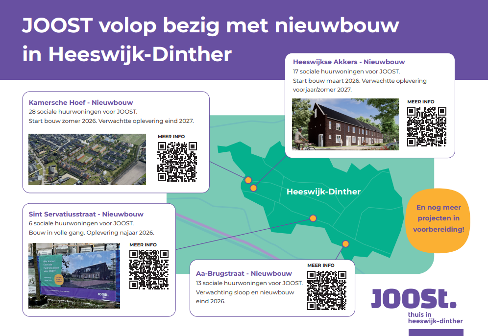 Op het adres Sint Servatiusstraat 11–15 in Heeswijk-Dinther wordt hard gewerkt aan 18 woningen, waarvan 6 sociale huurwoningen voor JOOST. Deze worden gebouw door aannemer Van Uden Bouwservice uit Heeswijk-Dinther. De bouw van de 12 sociale koopwoningen gaat via ontwikkelaar ‘By Brekel Vastgoed’.