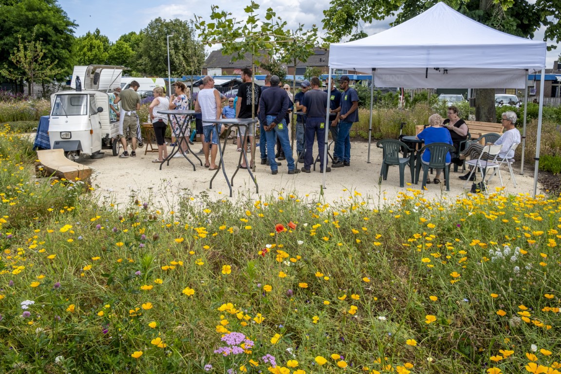 Donderdag 14 juli werd de buurttuin officieel geopend tijdens een gezellige en zonovergoten middag. “Het was veel werk om de verwaarloosde buurttuin om te toveren tot deze oase”, vertelde Mark Hamers, projectconsulent duurzaamheid van JOOST. “Veertig kuub compost was nodig om de bodem op orde te krijgen. Het resultaat is een fijne ontmoetingsplek voor buren, insecten en vogels. Ik ben eerlijk gezegd verbluft door het eindresultaat. We kunnen er allemaal enorm trots op zijn.”