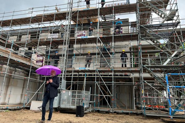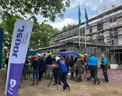 Onze directeur-bestuurder Rob Dekker: “We willen de bouwers hiermee graag bedanken voor hun inzet. Zij hebben vanaf september vorig jaar heel hard gewerkt. Het casco staat er, dus we kunnen nu beginnen aan de afbouw. We zitten ook mooi op schema, dus we verwachten de appartementen begin 2023 te kunnen opleveren.”