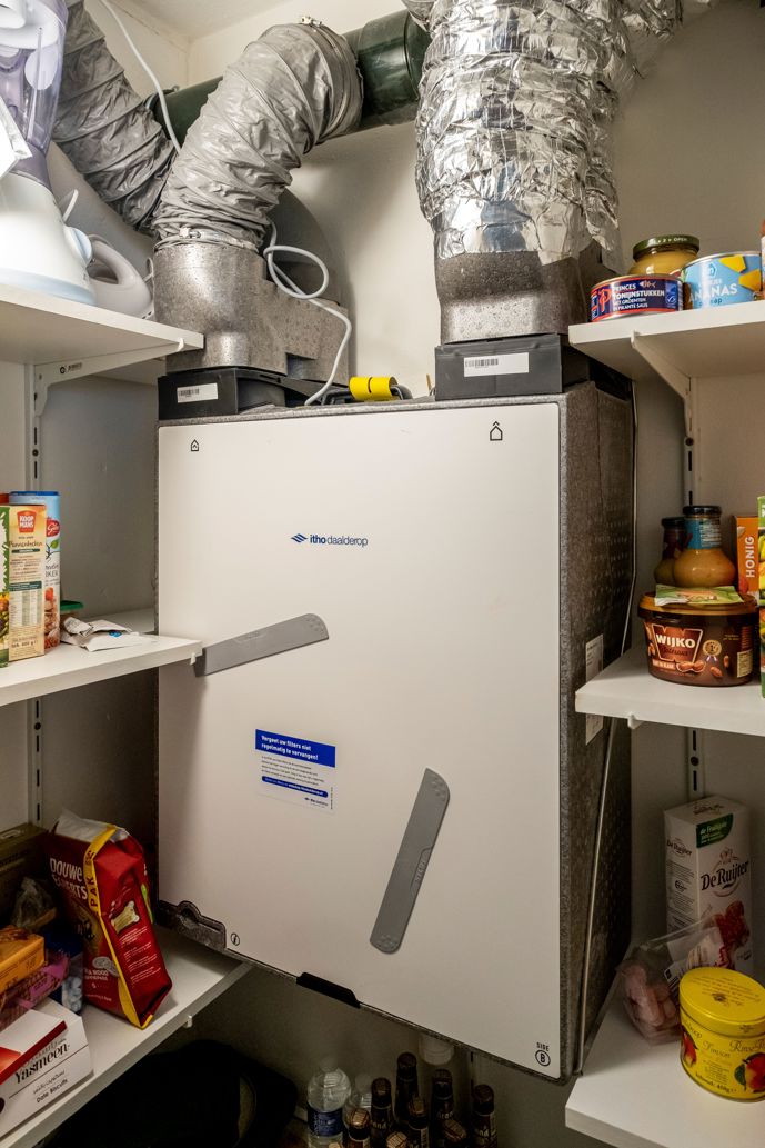 “Het hangt me niks in de weg”, verzekert Truus. “Ik heb wat minder plankruimte voor mijn potjes en blikken. Maar er blijft genoeg ruimte over. Dat heeft de timmerman netjes in orde gemaakt.” En het geluid? “Het zoemt alleen een beetje. Als ik mijn voorraadkast dicht doe, hoor ik zelfs helemaal niks. Het is in ieder geval een hele verbetering ten opzichte van mijn oude ventilatieroosters in de ramen. Die stonden altijd open voor frisse lucht. Maar via die dingen kwam er ook een hoop verkeerslawaai mee naar binnen. Dat heb ik nu niet meer.”