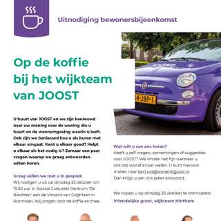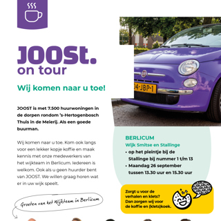 JOOST on Tour gaat weer van start. Want we willen graag horen wat er in de wijk speelt. Maandag 26 september komen we naar Berlicum.