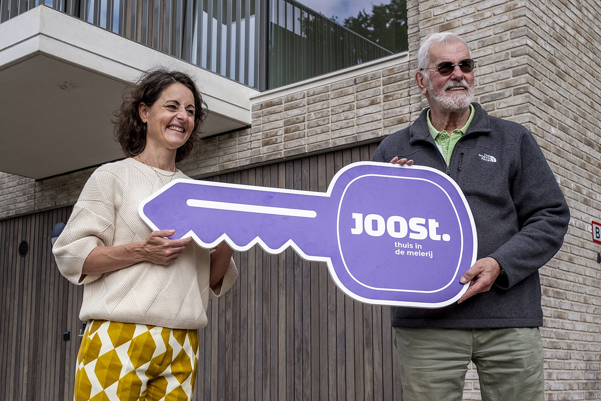Met trots overhandigde Marieke Vossen, directeur-bestuurder van JOOST, een fonkelnieuwe sleutel aan Cor Kievit, de eerste nieuwe bewoner.