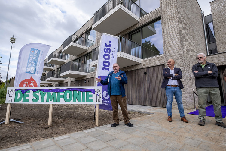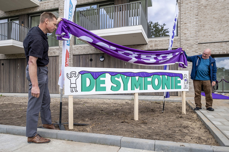 ‘De Symfonie’, zo luidt de naam van het woongebouw. Deze is bedacht door bewoner Ben Rijkers (65). “De Albinonistraat ligt in de componistenwijk van Boxtel. Albinoni was een componist die negen symfonieën heeft geschreven. Symfonie betekent letterlijk ‘samenklank’. Ik hoop dat we hier als bewoners fijn samen en ‘in harmonie’ zullen wonen.”