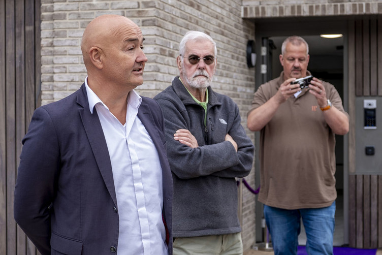 Van links naar rechts: Wim van der Zanden (gemeente Boxtel), René Beks (Hendriks Coppelmans) en nieuwe bewoner Cor Kievit met zijn zoon.