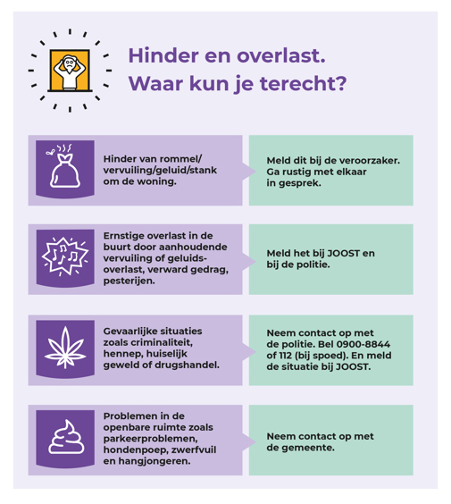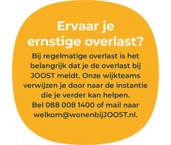 Heeft Buurtbemiddeling niet geholpen? En is de hinder uitgegroeid tot aanhoudende overlast? Dan kun je JOOST om advies vragen. Onze sociale wijkteams gaan dan met jouw melding aan de slag. Ze bespreken de situatie met jou en eventueel ook met de veroorzakers van de overlast. Verder hebben ze veel contacten met andere hebben ze veel contacten met andere organisaties. Zoals met de gemeente, de politie, de GGD en sociaal en maatschappelijk werk. Door naar jouw verhaal te luisteren, kunnen onze sociale wijkteams je vertellen welke vervolgstappen je kunt nemen. En welke (hulpverlenende) instanties daarbij voor jou klaar staan.
