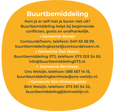Haalt je gesprek met je buren niks uit? Dan kun je gratis de hulp inschakelen van Buurtbemiddeling. Elke gemeente heeft een eigen aanmeldpunt. De buurtbemiddelaars van Buurtbemiddeling zijn opgeleide vrijwilligers uit je eigen gemeente. Zij gaan met jou en de buren (eventueel onafhankelijk van elkaar) in gesprek om te kijken wat nodig is om de situatie te verbeteren. En de problemen te bespreken om ze op te lossen. De buurtbemiddelaars zijn onafhankelijk en onpartijdig. Dat zorgt vaak voor een doorbraak in de situatie. En voor een oplossing die voor beide partijen aanvaardbaar is. JOOST is hierbij niet betrokken.