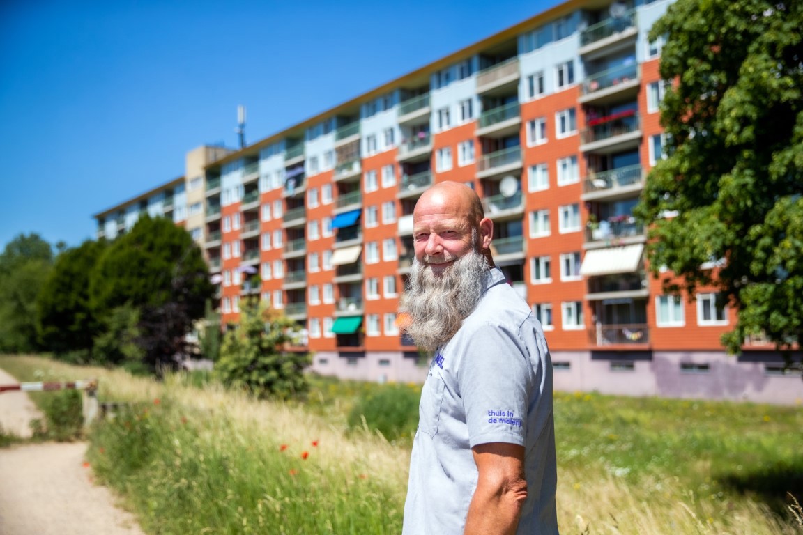 Zo is Patrick (op de foto hieronder voor de flats) de wijkbeheerder in Hintham. “Het BIC van JOOST zit in Hintham aan de Herman Moerkerklaan”, vertelt hij. “Dat is vlakbij de flats Hoogveld, De Engstoep en Fort Prins Willem waar veel van onze huurders wonen. Vroeger had je in zulke flats huismeesters. Die deden kleine reparaties, hielden een oogje in het zeil. Je kunt ons daar als wijkbeheerders wel een beetje mee vergelijken. Maar ons takenpakket is nu veel breder. Zeker, je moet bij ons zijn als er iets kapot is in een algemene ruimte. Maar we zijn er vooral voor zaken die de hele buurt aangaan. Zoals voor meldingen over onkruid in brandgangen. Of voor ondersteuning bij een buurtinitiatief. Een goed voorbeeld is de opening van de Huiskamer in Hoogveld samen met Farent. Daar kunnen buurtbewoners met elkaar koffie drinken. Of taallessen volgen.” Echte bouwtechnische dingen doet hij als wijkbeheerder niet. “Dan schakel ik onze opzichter in. Of één van onze aannemers. Maar als wijkbeheerders zijn we voor elke vraag wél het eerste aanspreekpunt.”