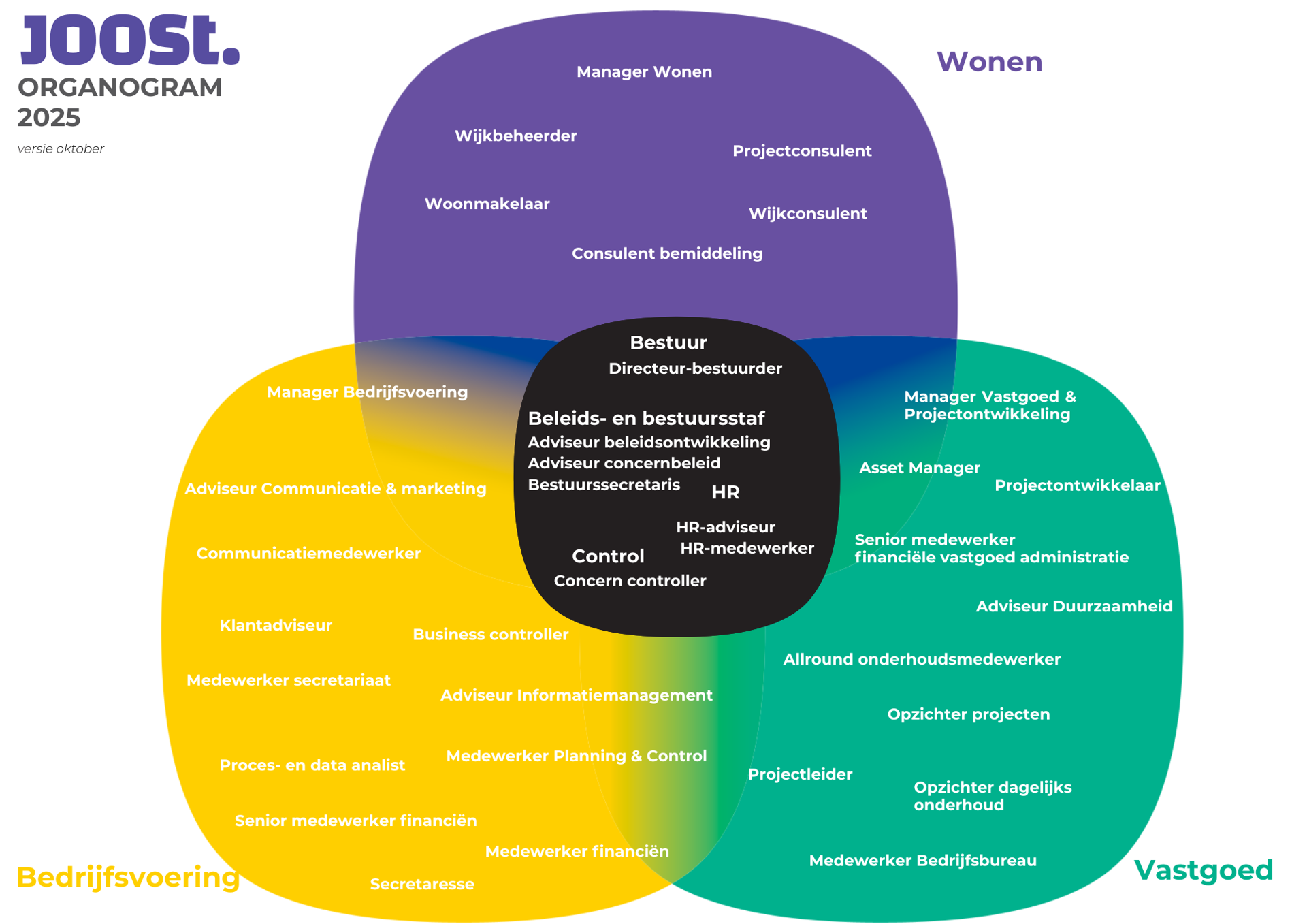 Woonstichting JOOST is per 1 juli 2019 ontstaan uit een fusie tussen St. Joseph uit Boxtel en Kleine Meierij uit Rosmalen. Er werken ruim 70 medewerkers bij JOOST. Hieronder vind je ons organogram.
